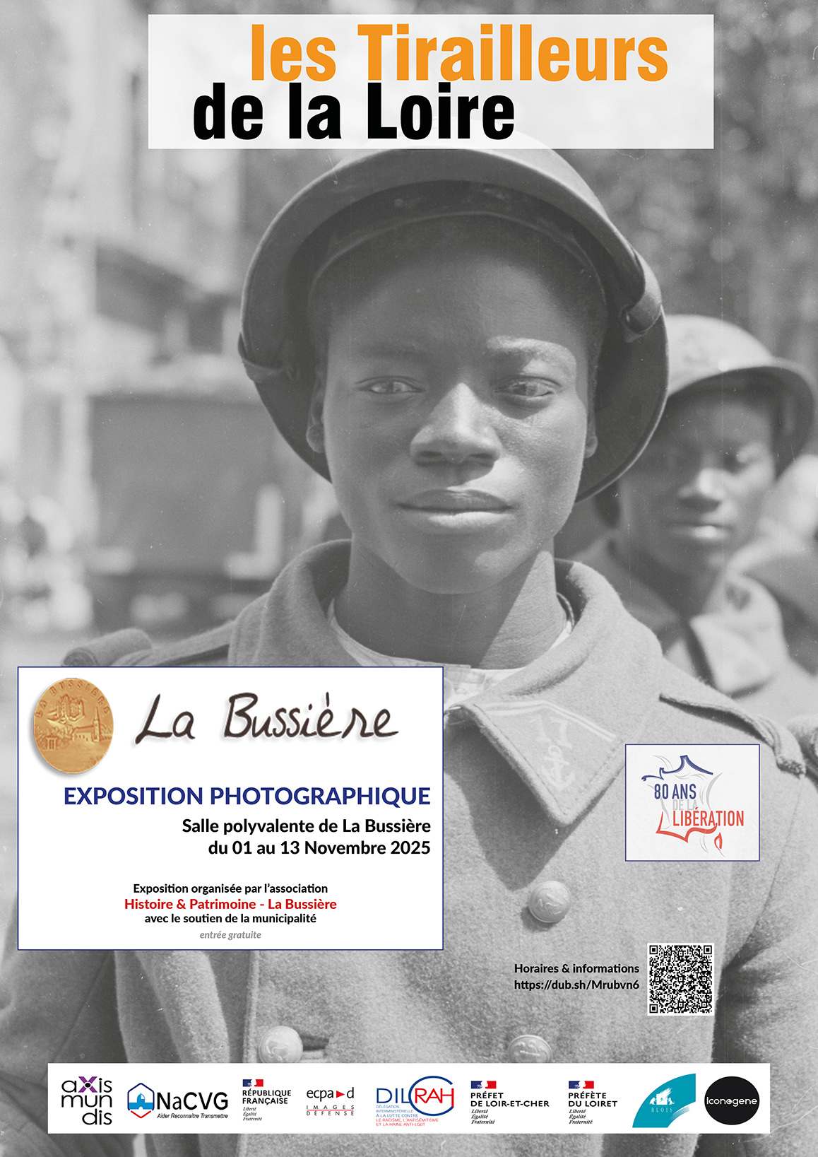 En partenariat avec l’ONaCVG, l’exposition photographique Les Tirailleurs de la Loire sera présentée du 1er au 13 Novembre 2025 à la salle Polyvalente de La Bussière (45) – proche de la Mairie dans le centre bourg.